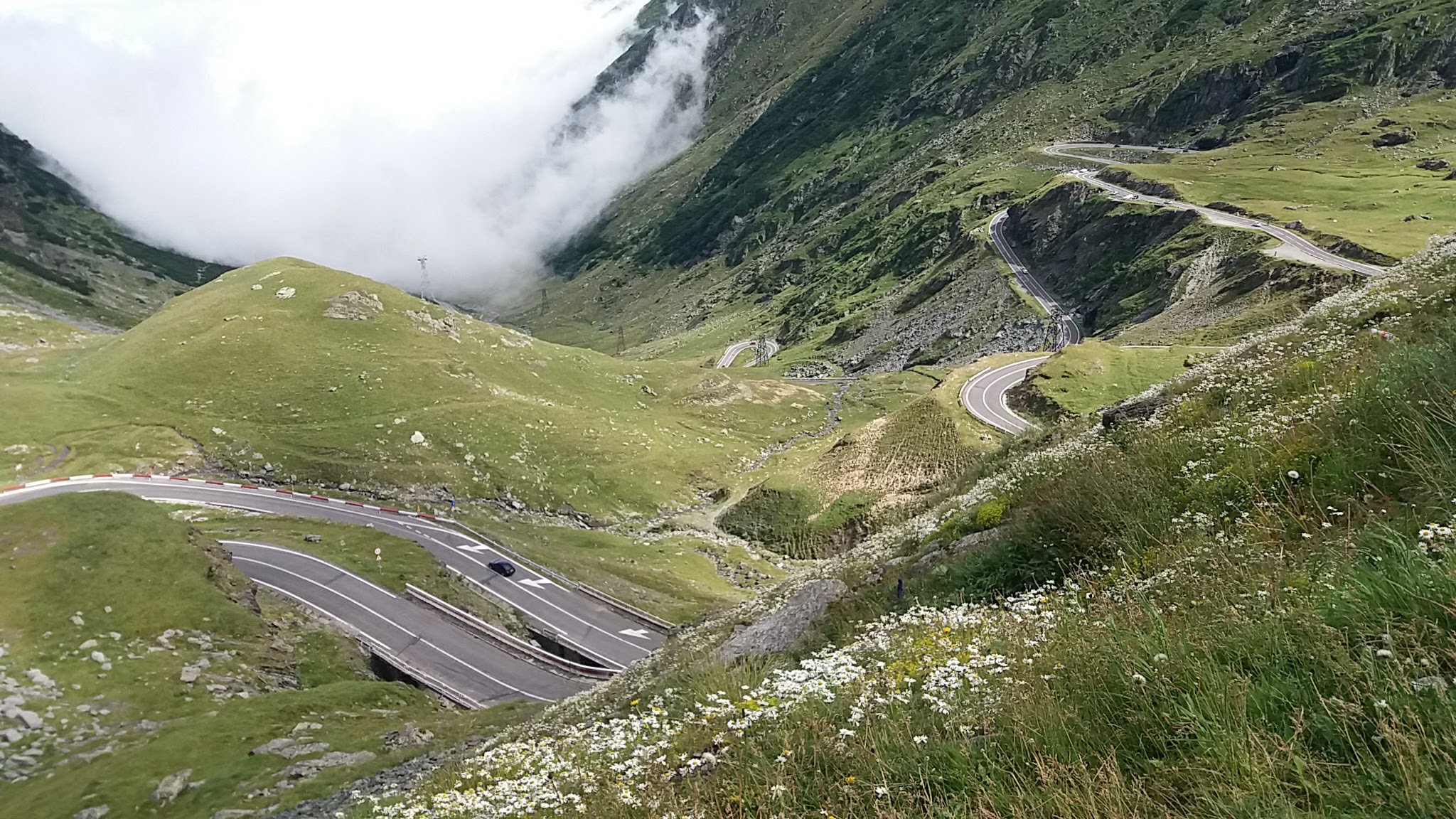 In the morning we went for a quick breakfast and tank refill to the gas station and went uphill on the curves of Transfogaras. The top is above the clouds and we still had snow in the middle of summer.