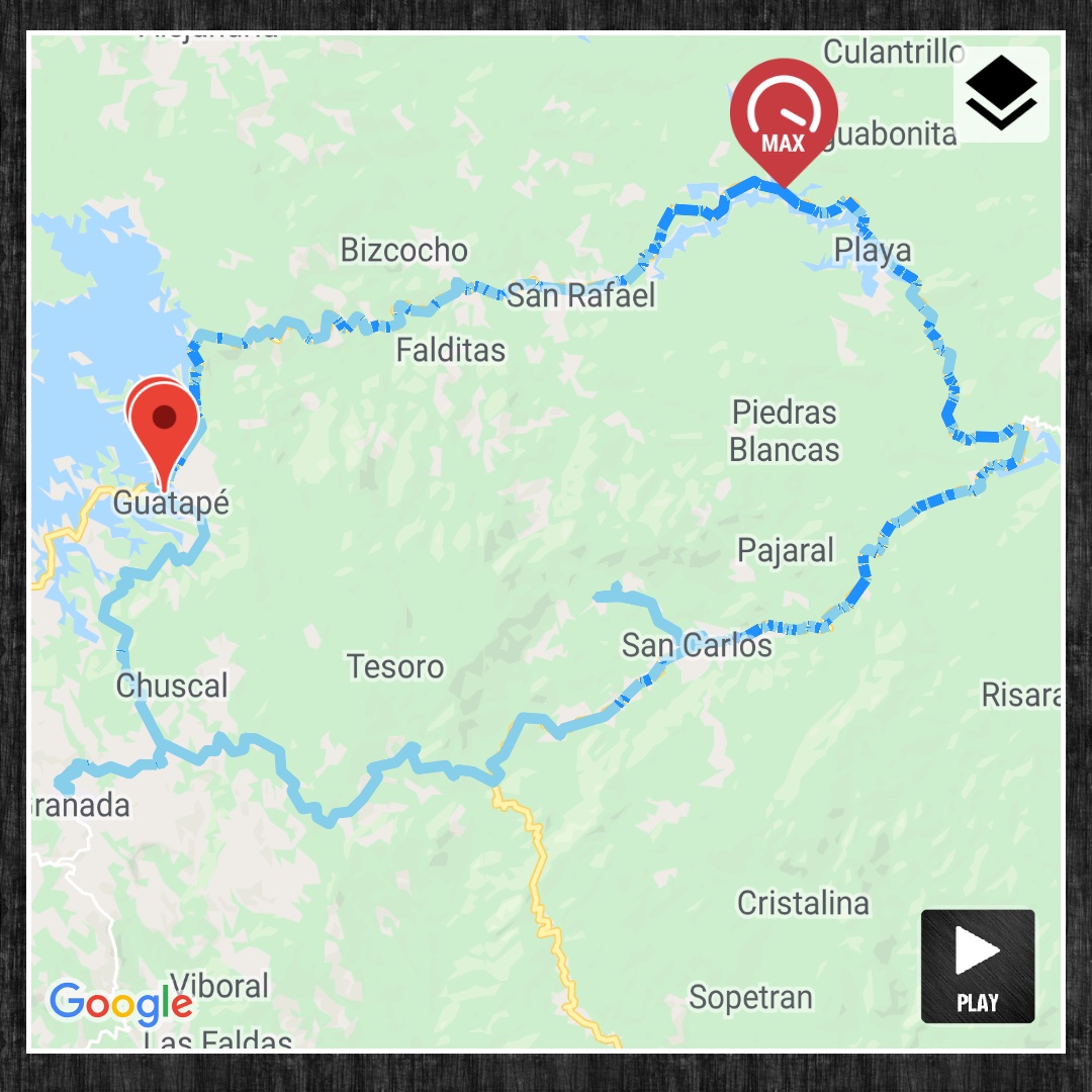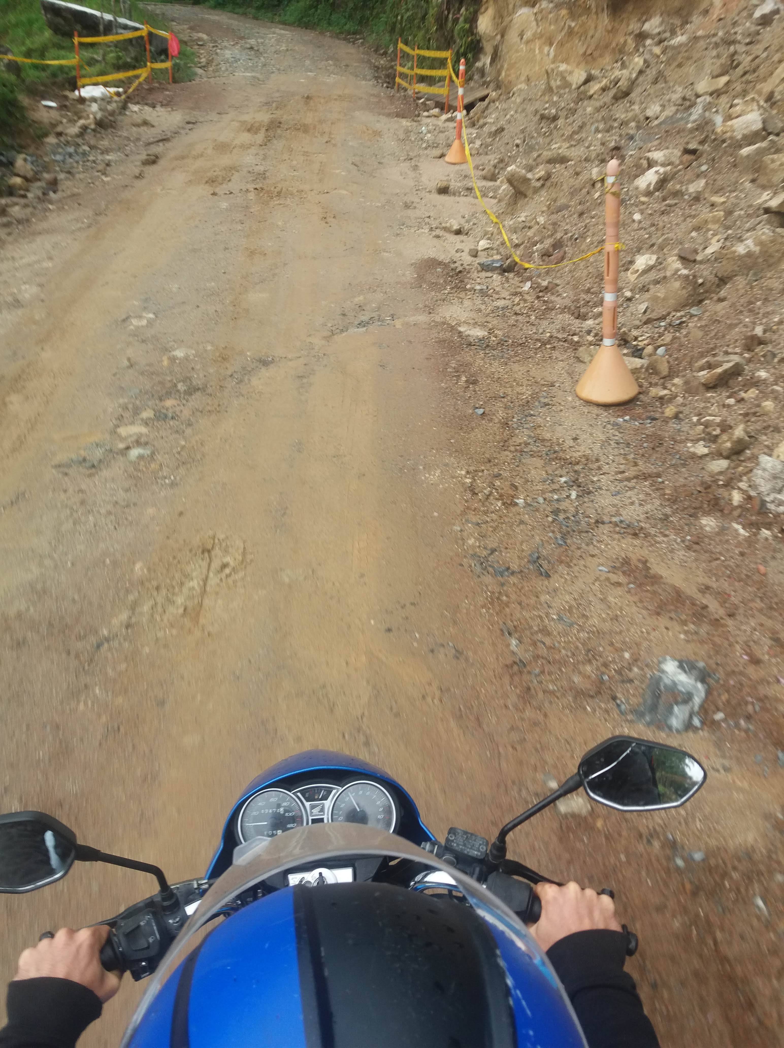 We started our day early on a Honda CB125 and we watched the sunrise from the road between Guatapé and San Rafael, which was beautifully lighting up our way through the serpentine. After San Rafael we got into a brand new road along the river and the lake, which was only having a couple of landslides after La Playa.
